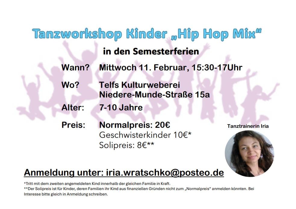 Tanztrainerin Iria Wratschko veranstaltet in den Semesterferien einen coolen Kinder-Tanzworkshop zu den Stilrichtungen Hip Hop / Urban Mix in der Kultur Weberei. Wann? Mittwoch, 11. Februar, 15.30 bis 17 Uhr Alter: 7 bis 10 Jahre Preis 20 Euro / Geschwisterkinder 10 Euro * / Soli-Preis: 8 Euro ** Anmeldung unter iria.wratschko@posteo.de * Tritt mit dem […]