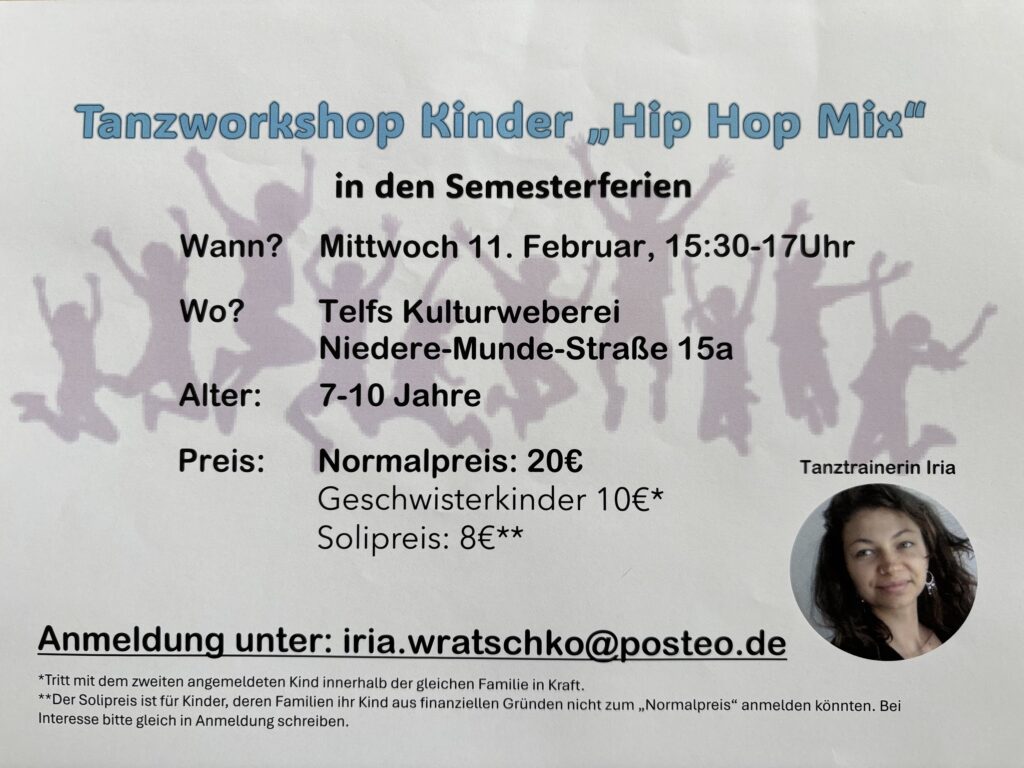 Tanztrainerin Iria Wratschko veranstaltet in den Semesterferien einen coolen Kinder-Tanzworkshop zu den Stilrichtungen Hip Hop / Urban Mix in der Kultur Weberei. Wann? Mittwoch, 11. Februar, 15.30 bis 17 Uhr […]